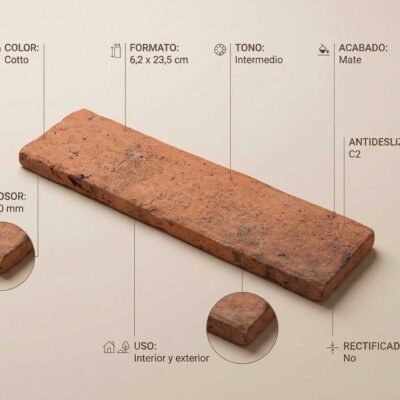 El porcelánico Porcelánico Benissa Cotto es una solución versátil que une diseño y rendimiento. En formato 6,2×23,5 cm, aporta un acabado equilibrado que encaja en múltiples estilos y ayuda a conseguir espacios actuales y luminosos. Además, incorpora propiedad antideslizante y acabado mate (MT).