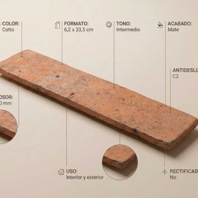 Un porcelánico pensado para vivirlo a diario. El Porcelánico Benissa Cotto aporta un diseño versátil, pensado para proyectos actuales en formato 6,2×23,5 cm con propiedad antideslizante y acabado mate (MT). Combina estética cuidada con una superficie preparada para el uso diario. Su formato compacto es ideal para composiciones con ritmo y detalle.