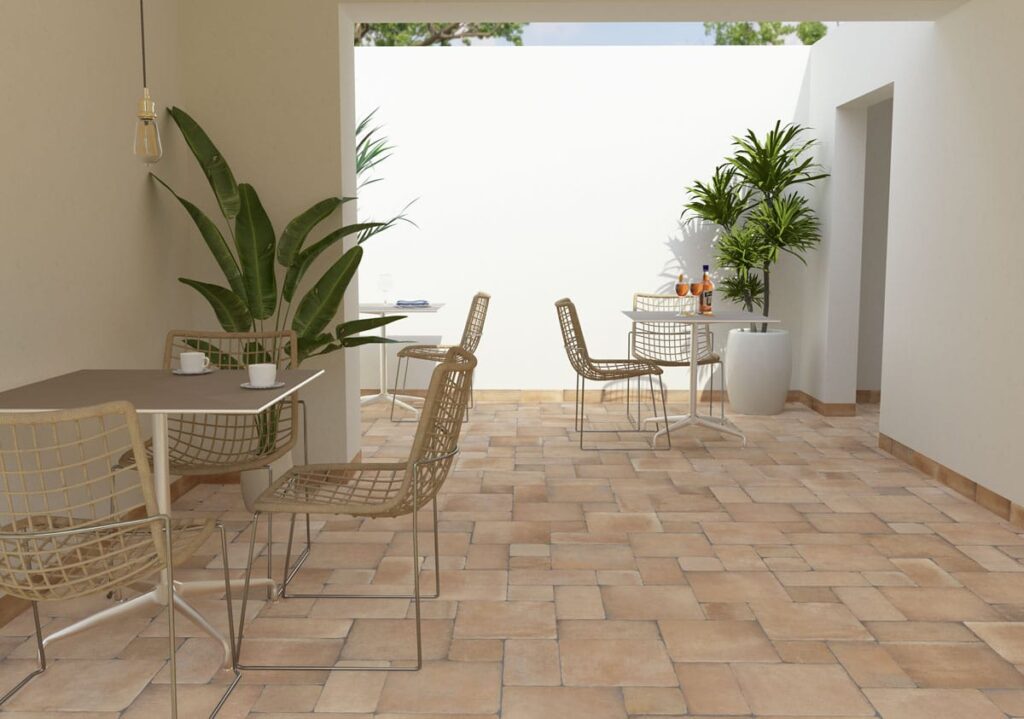 El porcelánico Benissa Teja es un azulejo inspiración rústico con acabado mate, apto para uso interior y exterior, que ofrece un tono claro.
