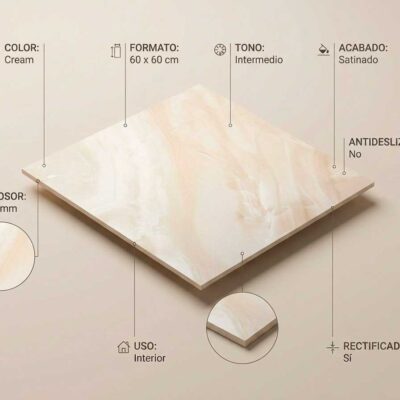 El modelo Porcelánico Diva Cream destaca por su presencia visual y la fiabilidad del porcelánico. En formato 60×60 cm, aporta una estética contemporánea fácil de combinar y ayuda a conseguir un ambiente moderno y acogedor. Además, incorpora canto rectificado y acabado satinado.