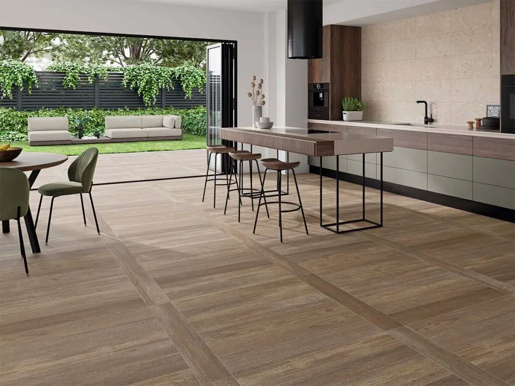 En formatos grandes, se recomienda una base bien nivelada y doble encolado para una colocación óptima. Si buscas un efecto madera más natural, alterna las piezas para evitar repeticiones visuales.