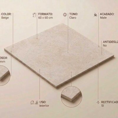 El modelo Porcelánico Ulisse Beige destaca por su presencia visual y la fiabilidad del porcelánico. En formato 60×60 cm, aporta un acabado equilibrado que encaja en múltiples estilos y ayuda a conseguir espacios actuales y luminosos. Además, incorpora canto rectificado y acabado mate (MT).