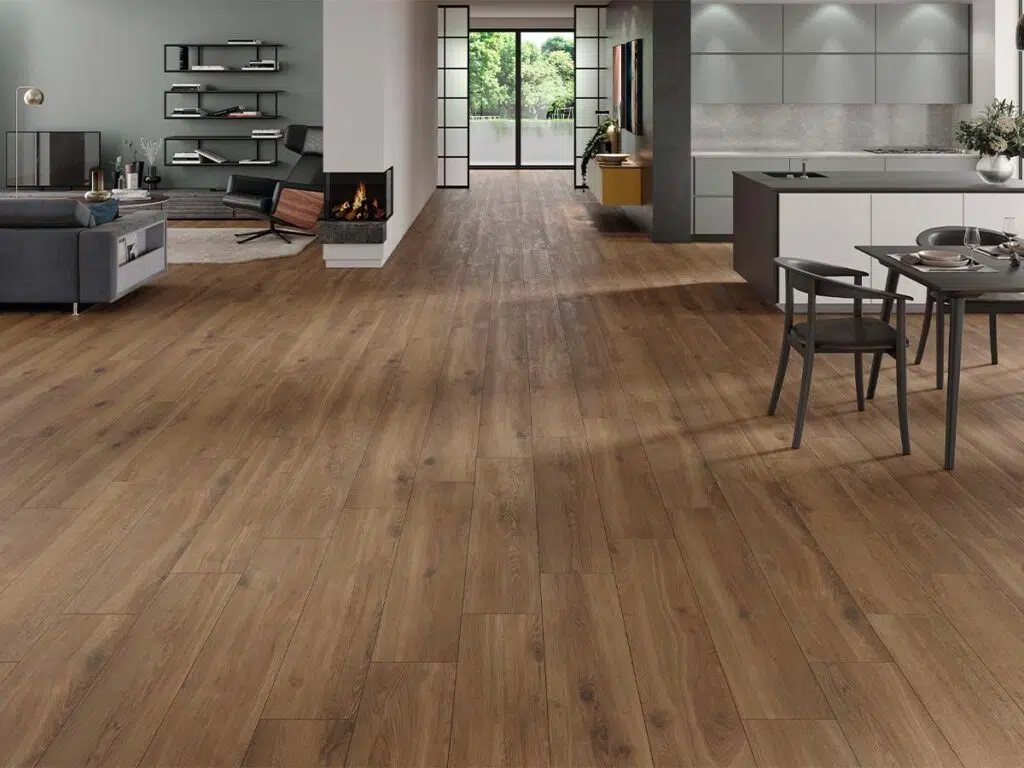Con Porcelánico Volte Nogal consigues un acabado equilibrado donde la estética y la durabilidad van de la mano. En formato 23×120 cm, aporta la estética de la madera en una superficie práctica para el día a día y ayuda a conseguir espacios con carácter y confort. Además, incorpora canto rectificado y acabado mate (MT).